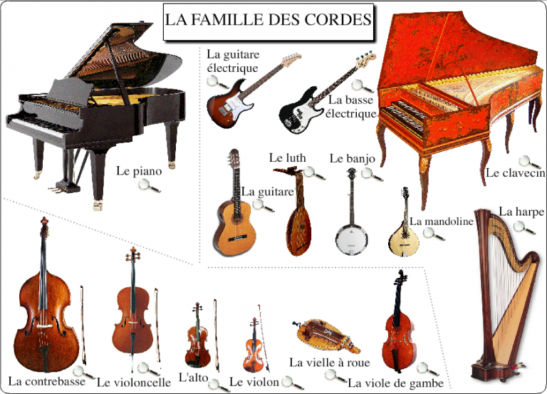sont composés de cordes tendues, qui sont frappées méchaniquement ou manuellement avec des marteaux, des baguettes ou à mains nues. Les instruments les plus connus de cette famille sont outre le piano,